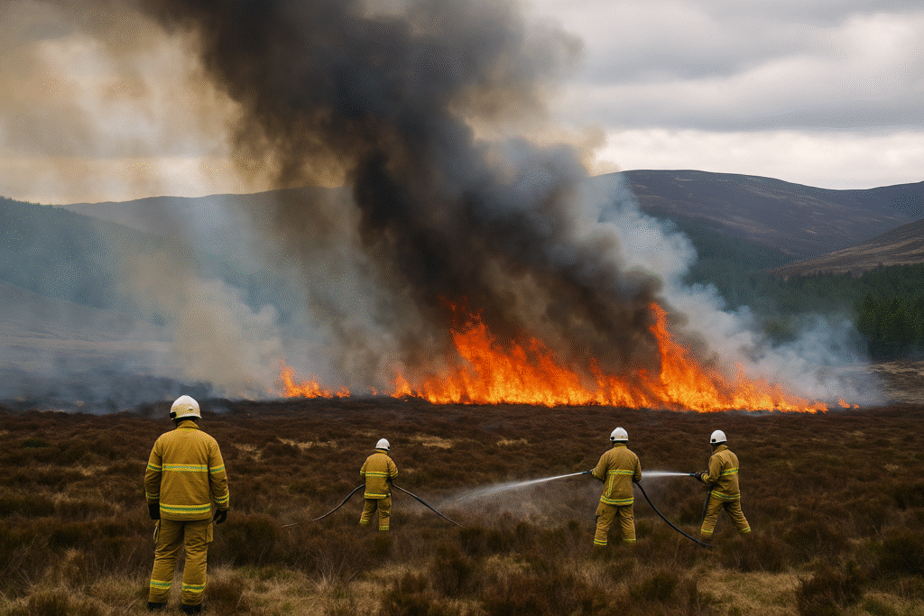 Wildfires in the Scottish Highlands near Grantown-on-Spey prompt road closures and tourist alerts. Fire crews battle flames as safety and travel warnings intensify.