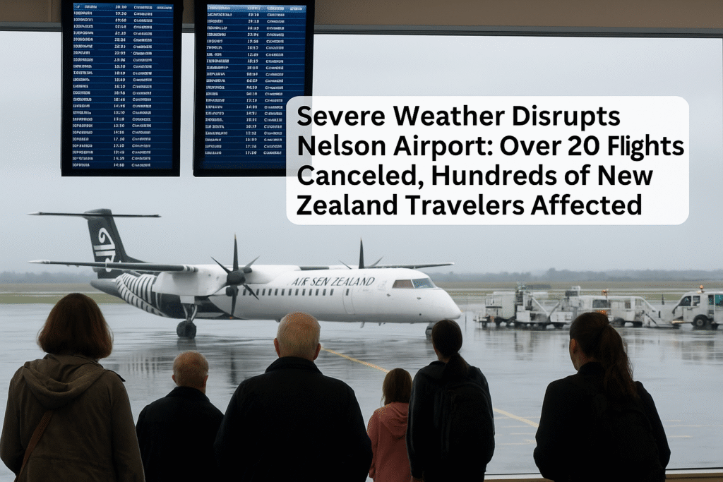 Severe weather causes major flight delays and over 20 cancellations at Nelson Airport, stranding travelers across New Zealand. Passengers face rebookings and detours.