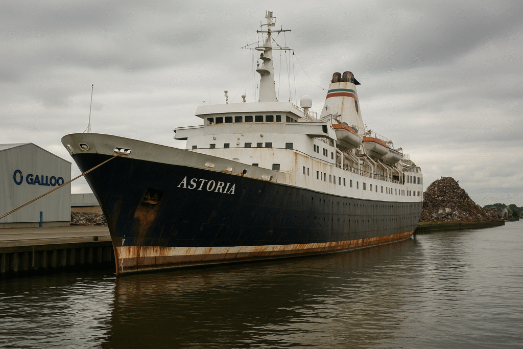 Historic cruise ship Astoria will be dismantled in Belgium’s Galloo yard with 95% material recycling, marking the eco-conscious end of a 75-year maritime journey.