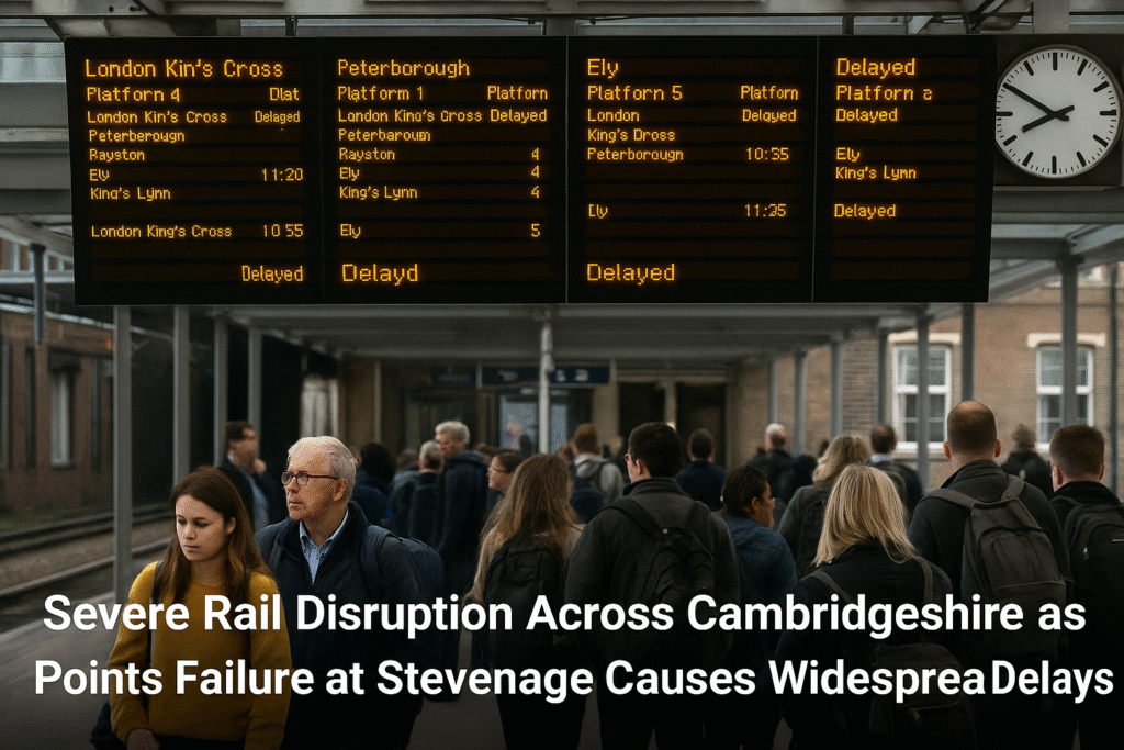 A major points failure at Stevenage is causing significant train delays and cancellations across Cambridgeshire, affecting key routes including Ely, Cambridge, and Peterborough. Disruption expected until 6pm.